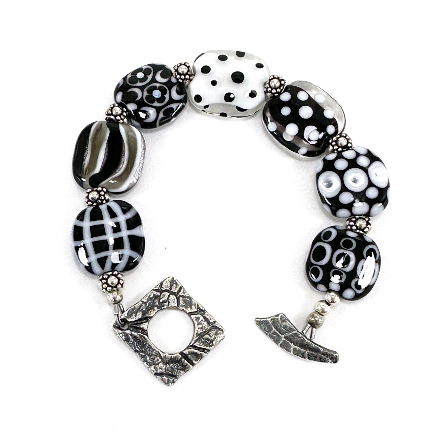 Born in the flame from soft Italian glass in black, white, and clear, these bracelets are finished with custom fine silver clasps bearing deliciously interesting texture. This bead style is so comfortable you can wear it while working on the computer.
